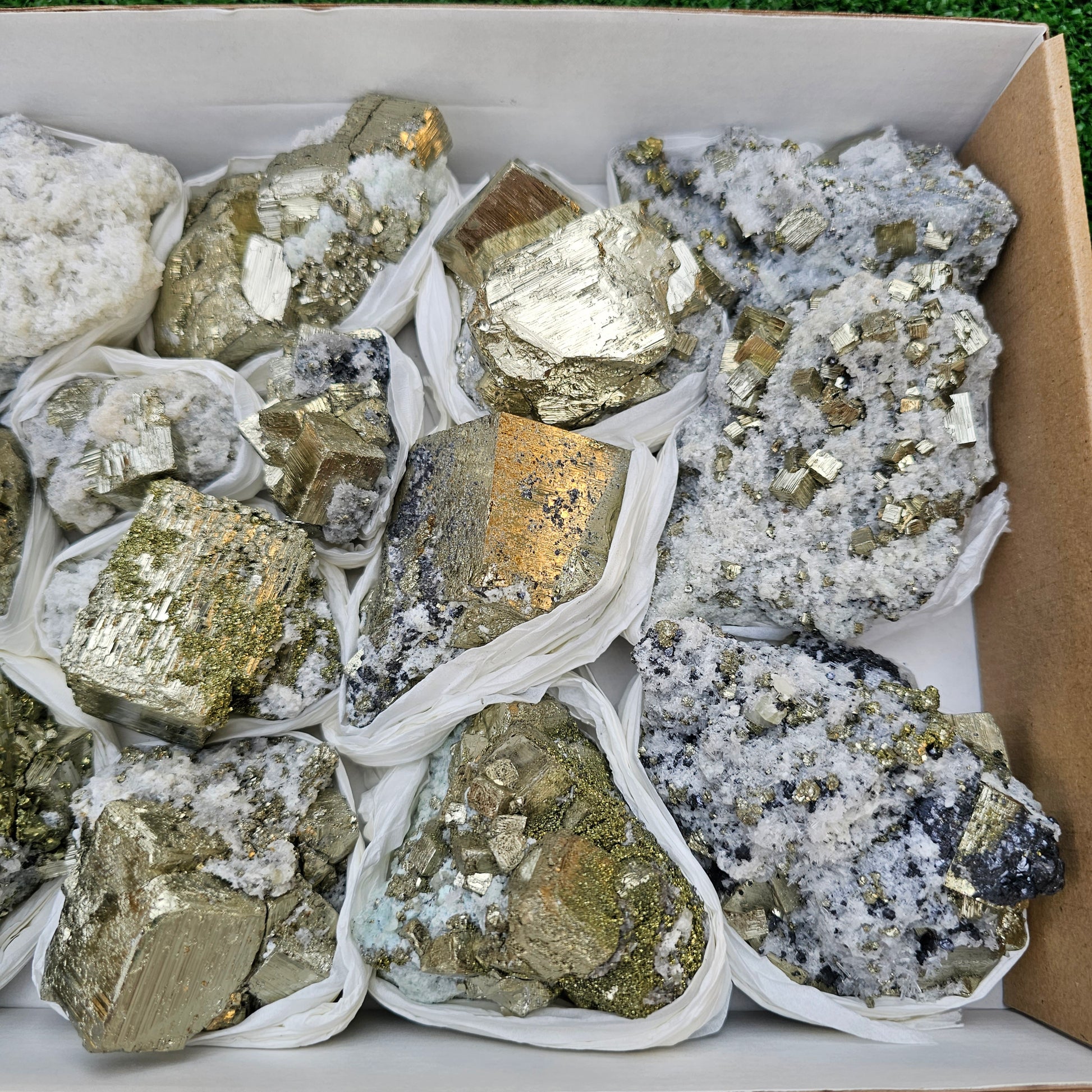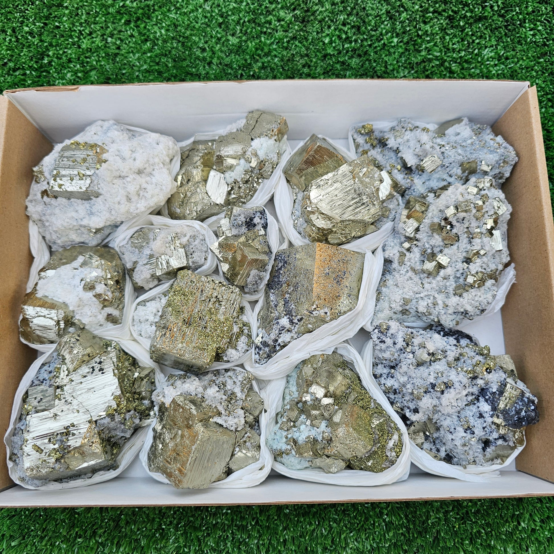 14 pc Pyrite Cubic with calcite flourecent