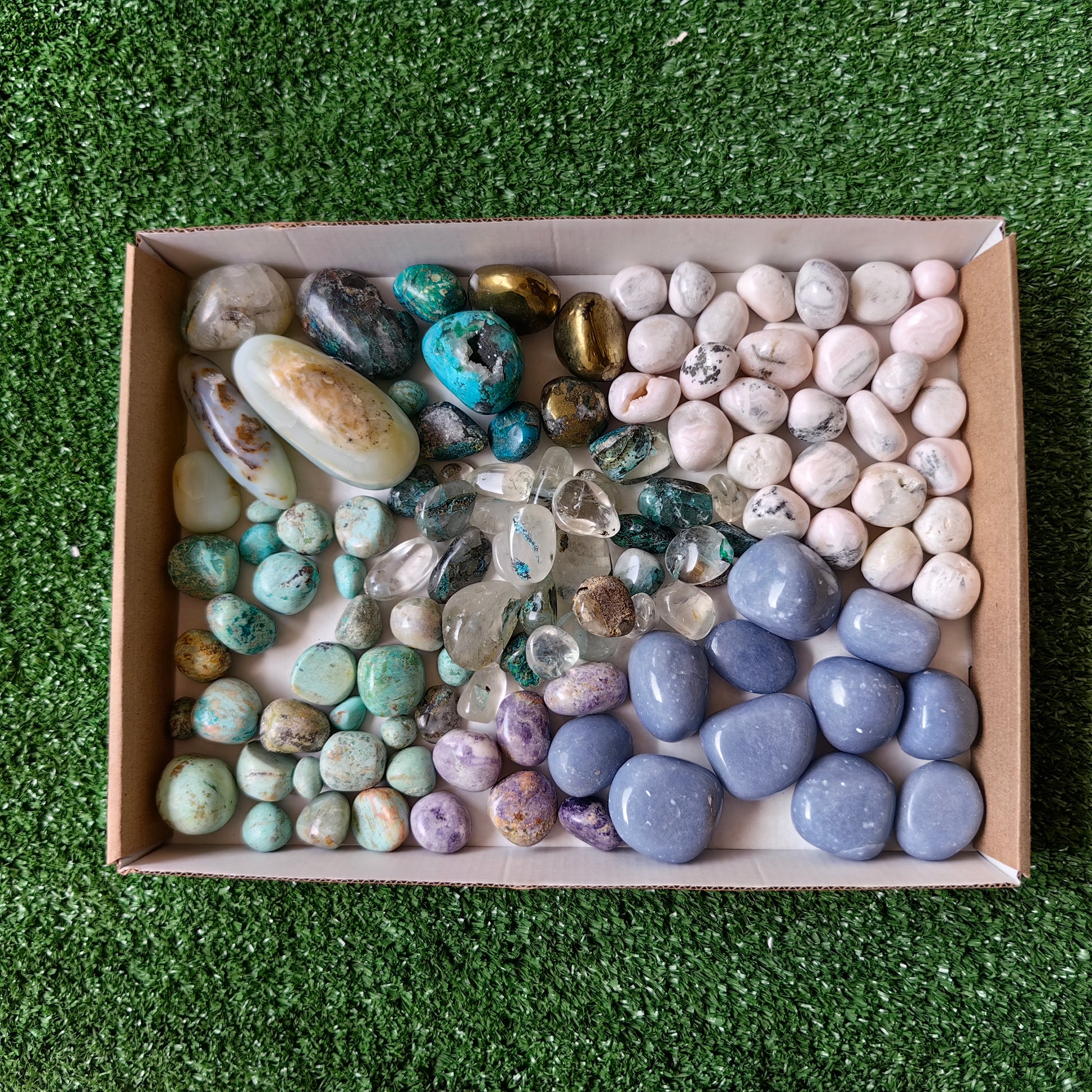 2 kg tumbled mixted angelite / mangano calcite / opal / bolivianite / chalcopyrite / chrysocolla