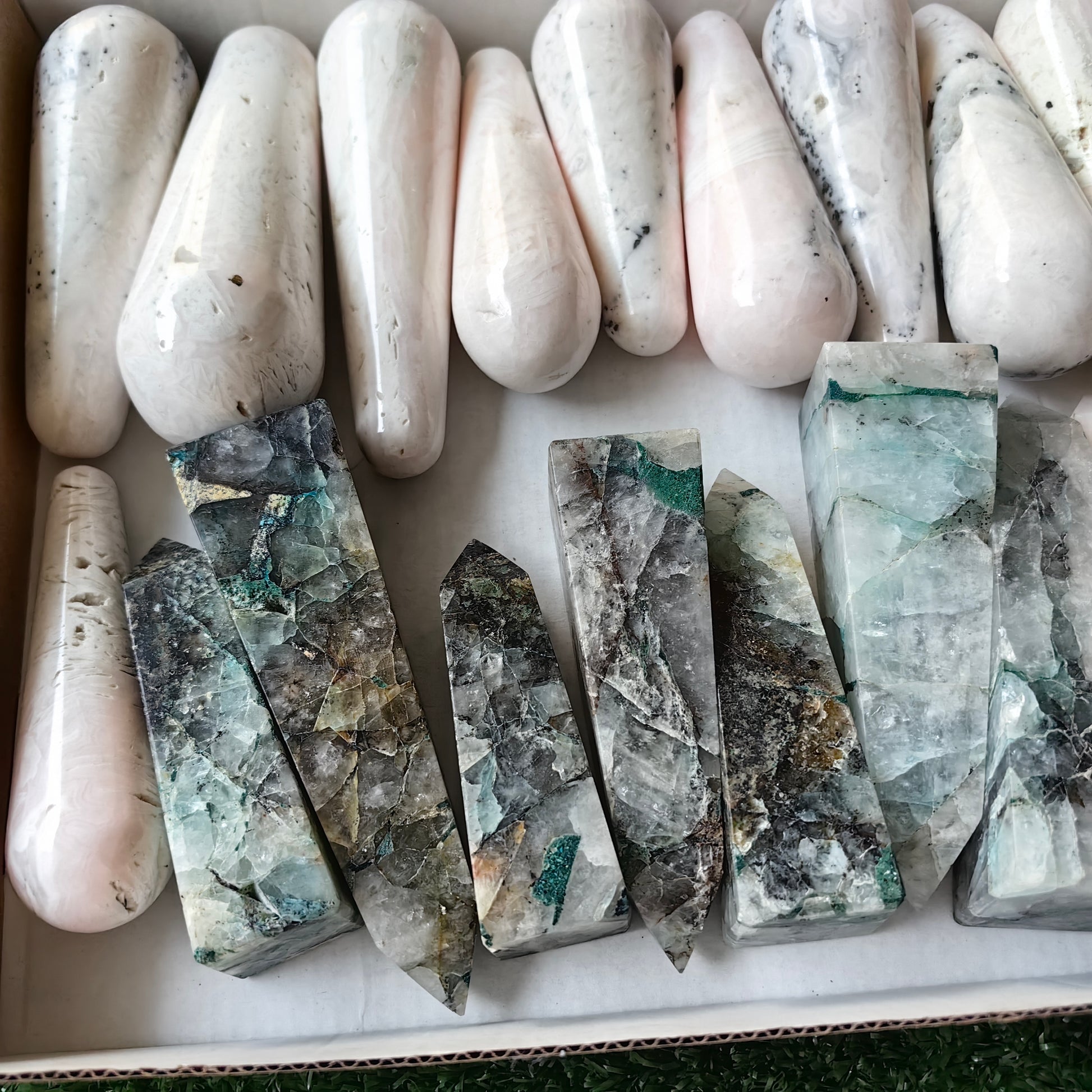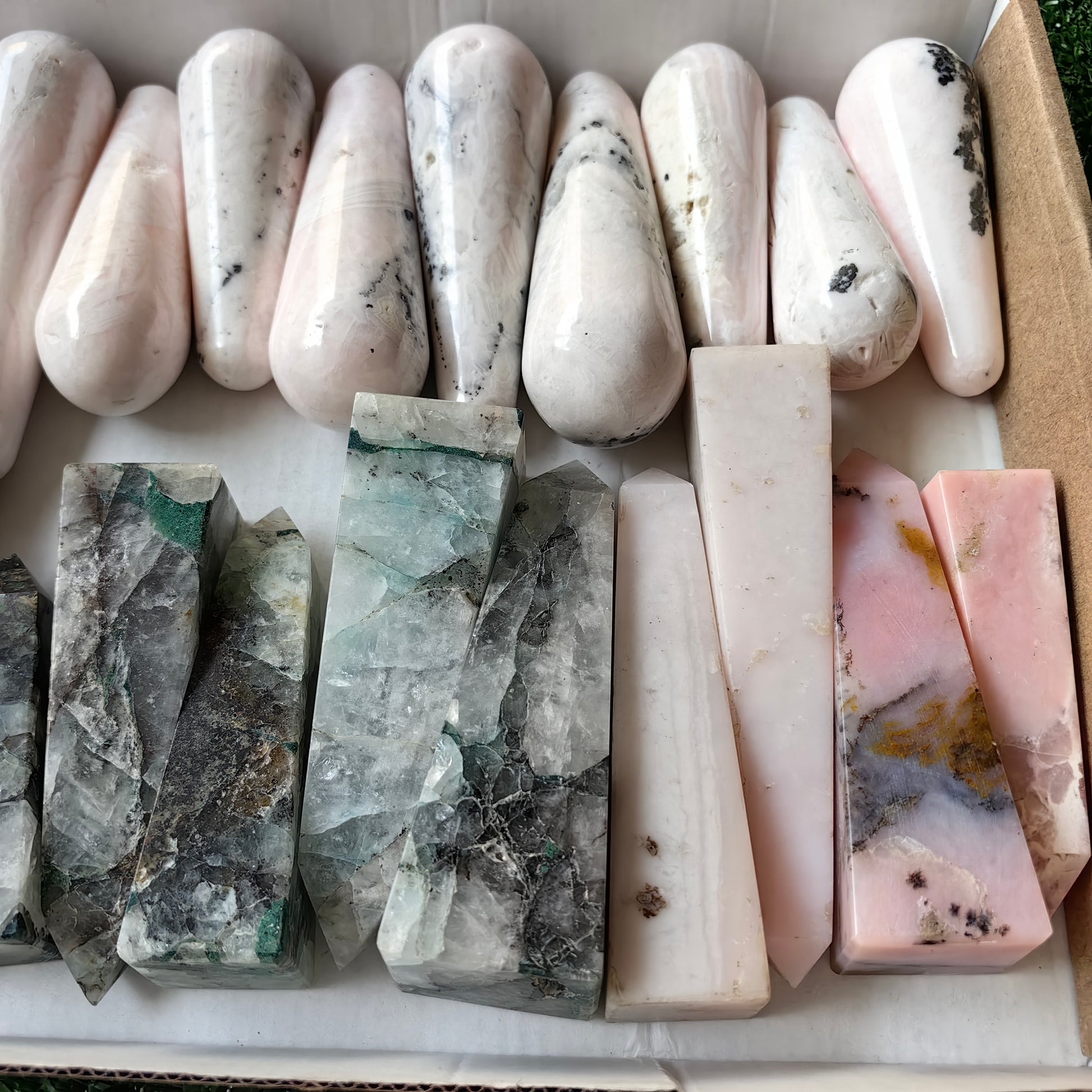 23 pc mangano calcite wands & pink opal, chrysocolla quartz towers