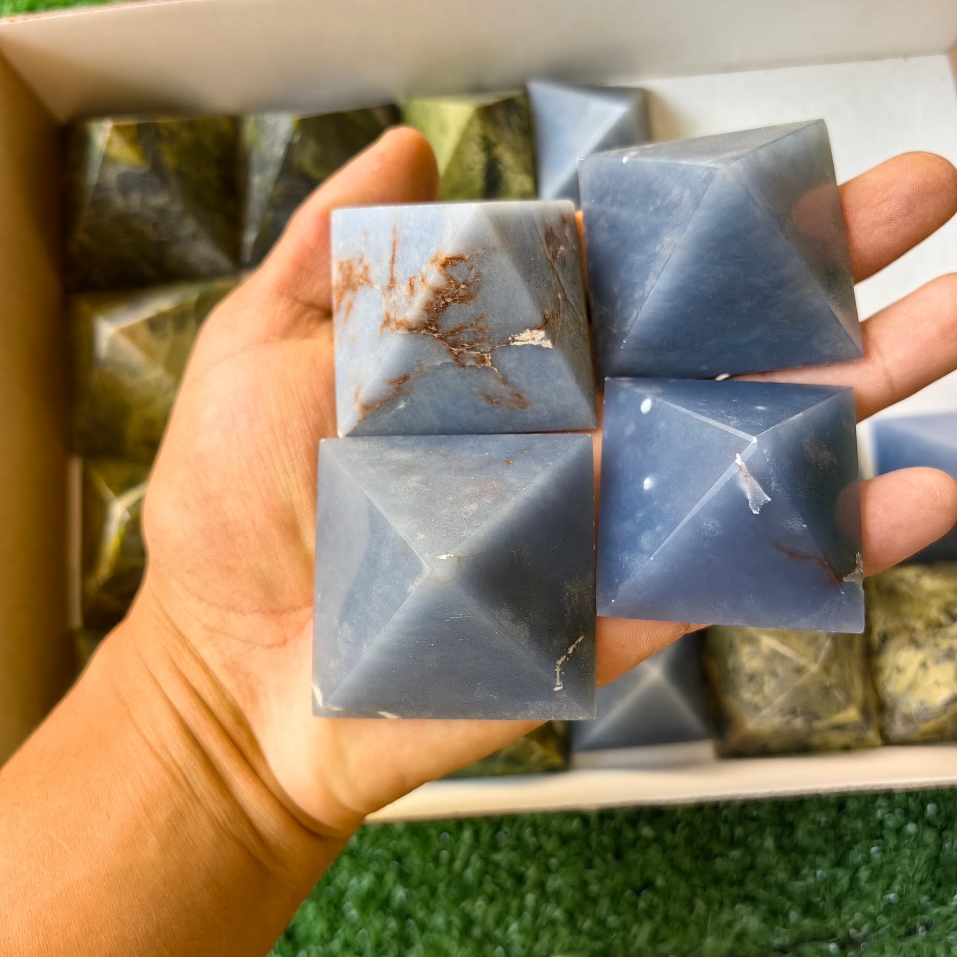 Item: blue angelite & serpentine pyramids