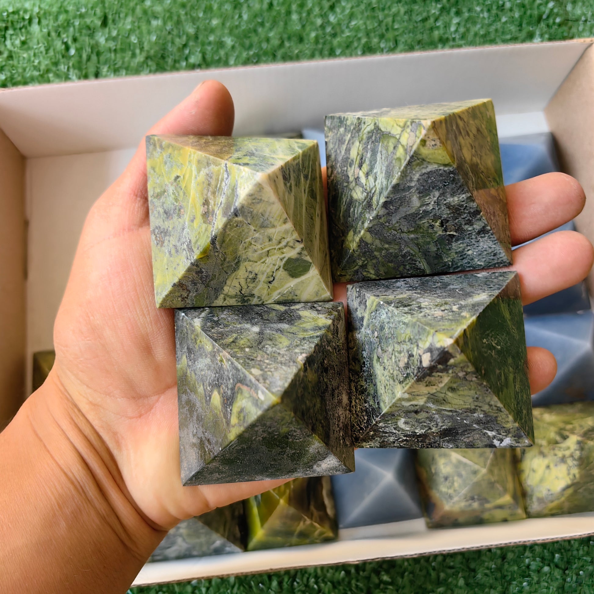 25 pc blue angelite & serpentine pyramids