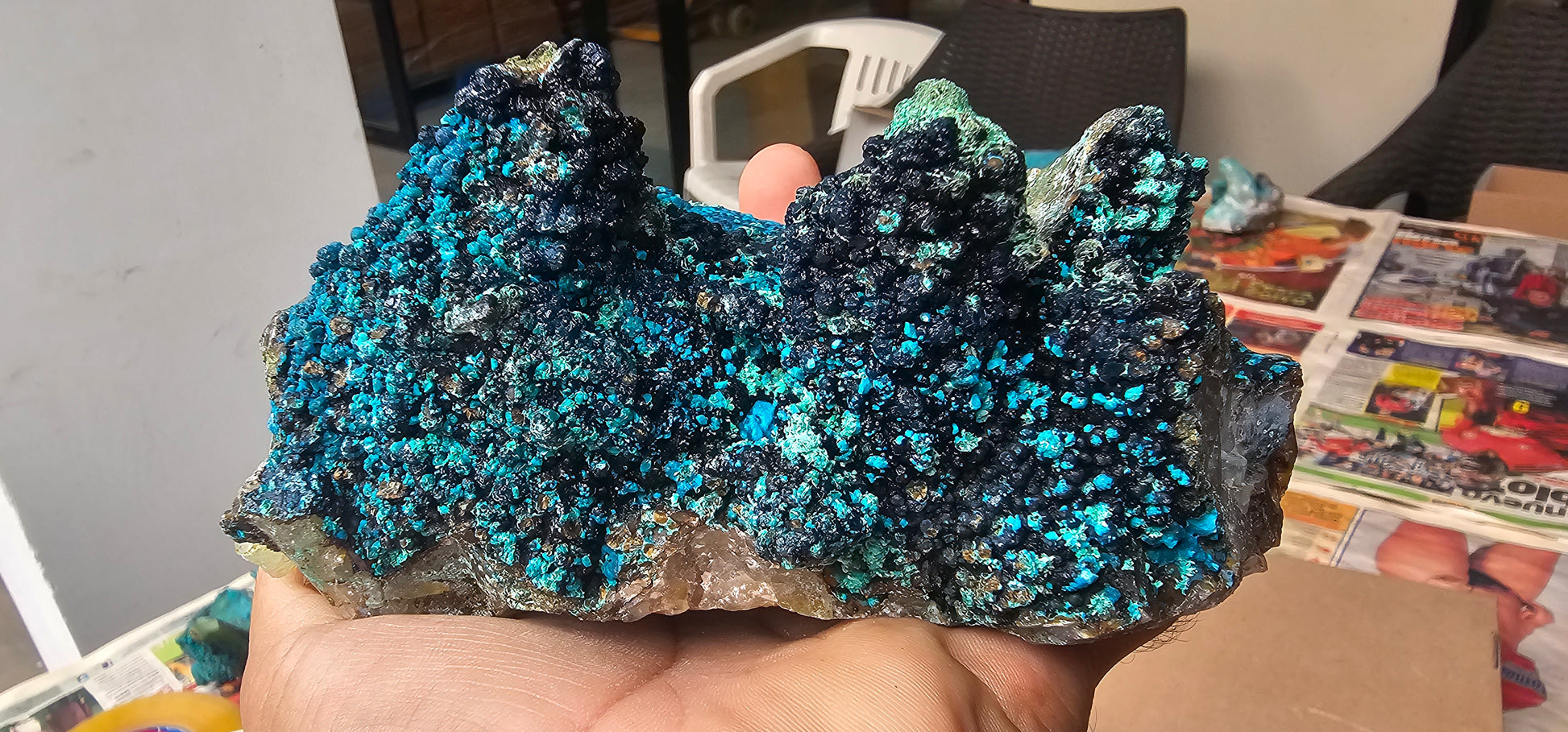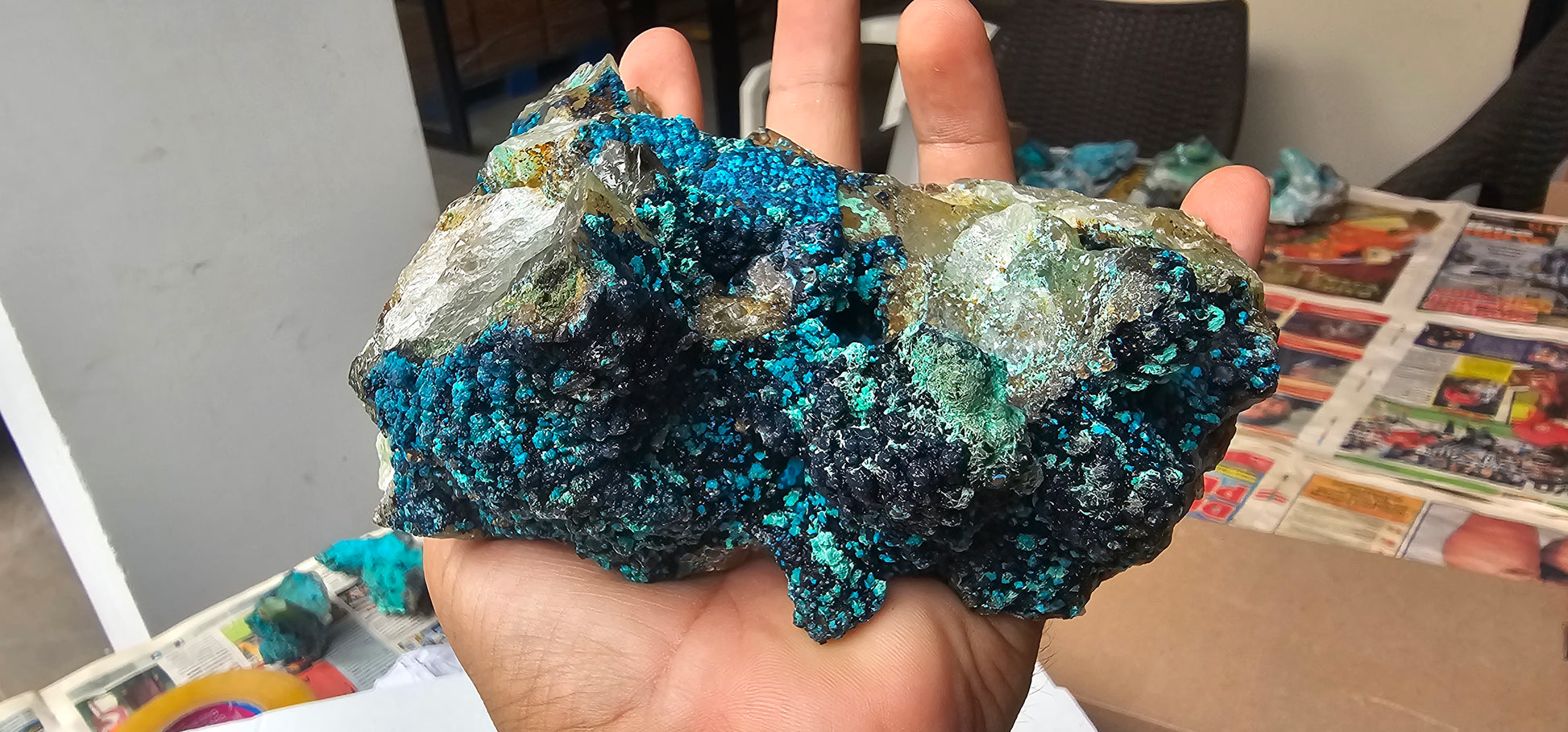 A pair of Quartz crystals are coated by two colorful generations of Chrysocolla on this Tentadora Mine specimen from a small find of 2018. It features richly colored Chrysocolla coating two prismatic and terminated Quartz crystals. The first generation of Chrysocolla is a deep turquoise-blue and looks as though it was airbrushed on the Quartz and it completely covers the crystals. The second generation of Chrysocolla is more complex as it occurs as bubbly growths on the earlier generation and selectively covers only half of the Quartz prisms leaving the terminations mostly uncovered so the points are quite prominent. This later generation is more of a green-blue color and the bubbly surface is a few millimeters thick. This piece has both fantastic textural and color contrast. It is one of a few elegant and high level pieces of a pocket that produced very few great specimens, and we bought all we could all at the time.