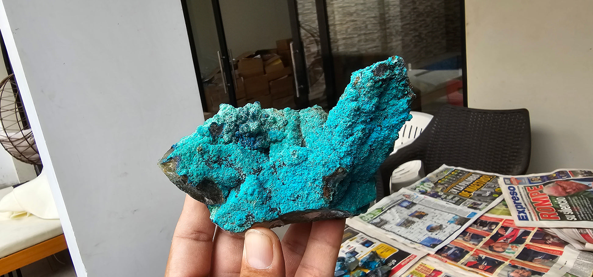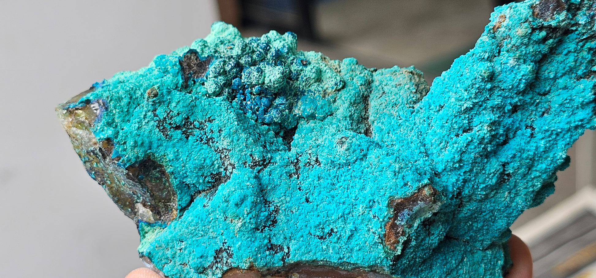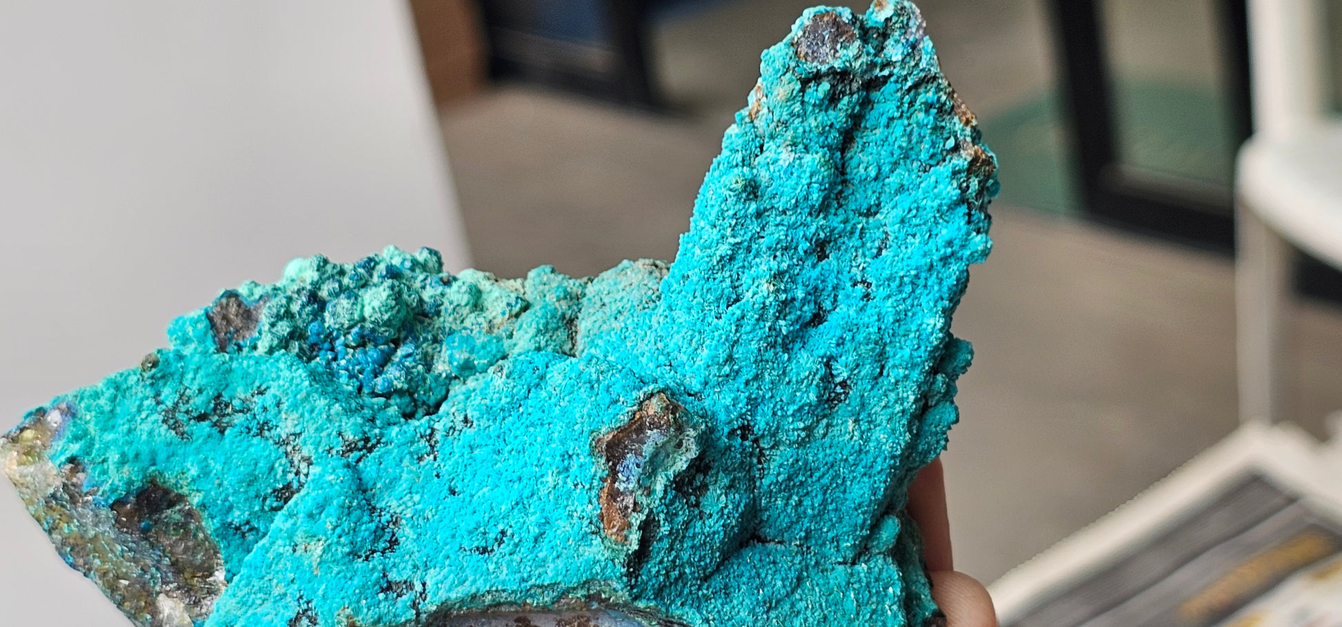 A pair of Quartz crystals are coated by two colorful generations of Chrysocolla on this Tentadora Mine specimen from a small find of 2018. It features richly colored Chrysocolla coating two prismatic and terminated Quartz crystals. The first generation of Chrysocolla is a deep turquoise-blue and looks as though it was airbrushed on the Quartz and it completely covers the crystals. The second generation of Chrysocolla is more complex as it occurs as bubbly growths on the earlier generation and selectively covers only half of the Quartz prisms leaving the terminations mostly uncovered so the points are quite prominent. This later generation is more of a green-blue color and the bubbly surface is a few millimeters thick. This piece has both fantastic textural and color contrast. It is one of a few elegant and high level pieces of a pocket that produced very few great specimens, and we bought all we could all at the time.