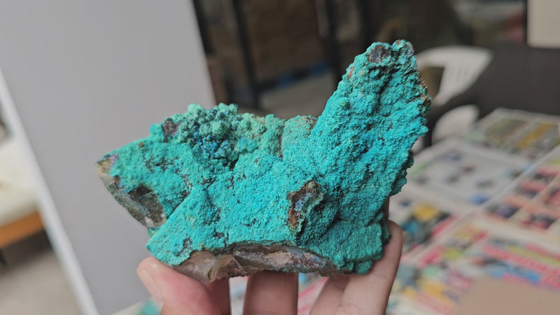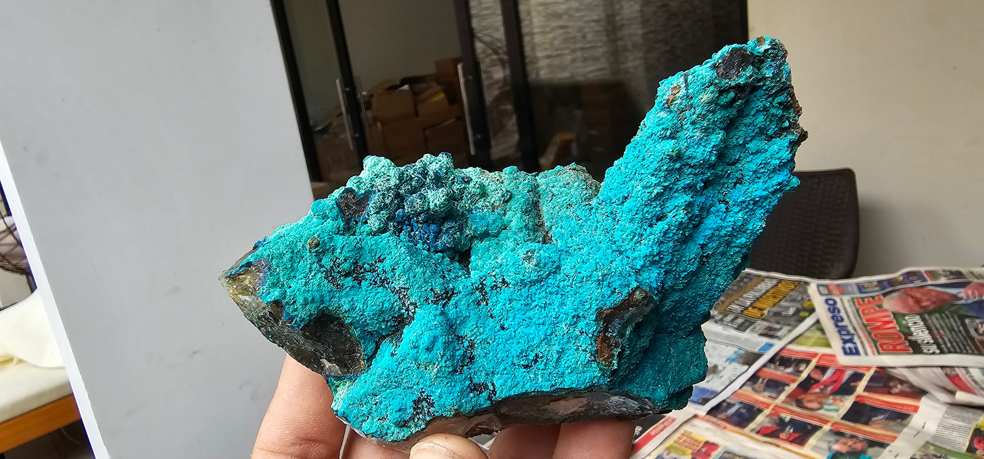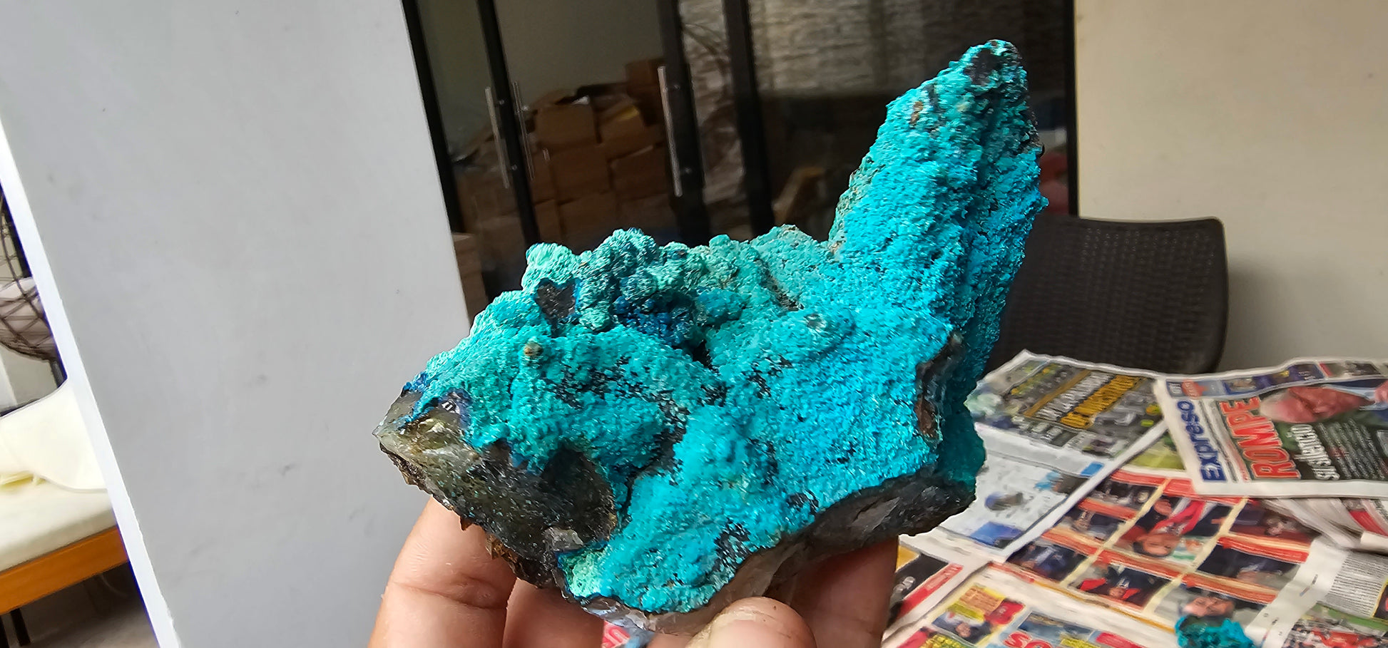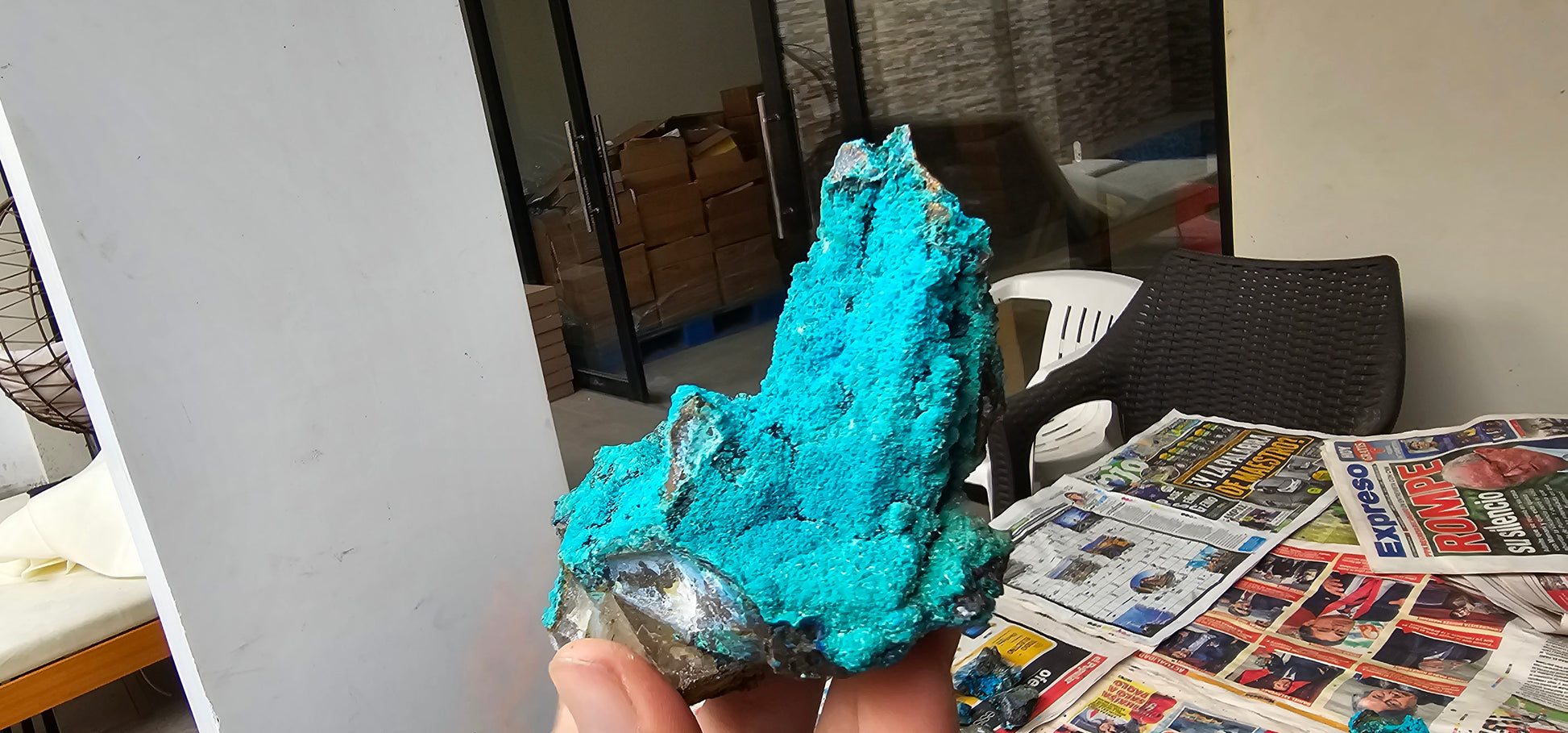A pair of Quartz crystals are coated by two colorful generations of Chrysocolla on this Tentadora Mine specimen from a small find of 2018. It features richly colored Chrysocolla coating two prismatic and terminated Quartz crystals. The first generation of Chrysocolla is a deep turquoise-blue and looks as though it was airbrushed on the Quartz and it completely covers the crystals. The second generation of Chrysocolla is more complex as it occurs as bubbly growths on the earlier generation and selectively covers only half of the Quartz prisms leaving the terminations mostly uncovered so the points are quite prominent. This later generation is more of a green-blue color and the bubbly surface is a few millimeters thick. This piece has both fantastic textural and color contrast. It is one of a few elegant and high level pieces of a pocket that produced very few great specimens, and we bought all we could all at the time.