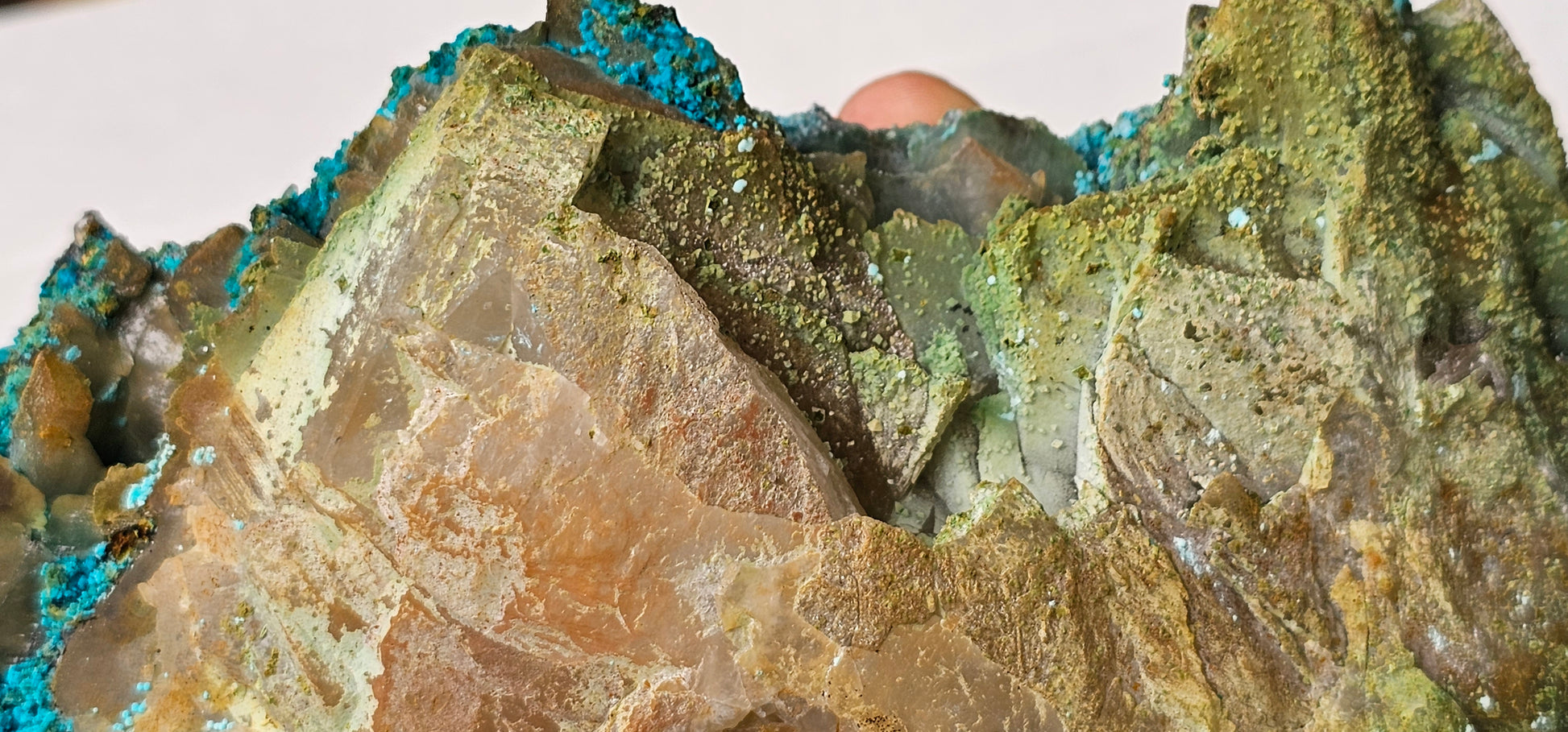 A pair of Quartz crystals are coated by two colorful generations of Chrysocolla on this Tentadora Mine specimen from a small find of 2018. It features richly colored Chrysocolla coating two prismatic and terminated Quartz crystals. The first generation of Chrysocolla is a deep turquoise-blue and looks as though it was airbrushed on the Quartz and it completely covers the crystals. The second generation of Chrysocolla is more complex as it occurs as bubbly growths on the earlier generation and selectively covers only half of the Quartz prisms leaving the terminations mostly uncovered so the points are quite prominent. This later generation is more of a green-blue color and the bubbly surface is a few millimeters thick. This piece has both fantastic textural and color contrast. It is one of a few elegant and high level pieces of a pocket that produced very few great specimens, and we bought all we could all at the time.