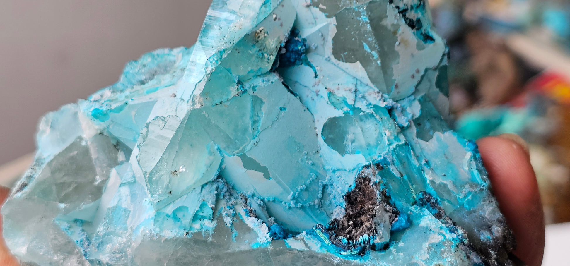A pair of Quartz crystals are coated by two colorful generations of Chrysocolla on this Tentadora Mine specimen from a small find of 2018. It features richly colored Chrysocolla coating two prismatic and terminated Quartz crystals. The first generation of Chrysocolla is a deep turquoise-blue and looks as though it was airbrushed on the Quartz and it completely covers the crystals. The second generation of Chrysocolla is more complex as it occurs as bubbly growths on the earlier generation and selectively covers only half of the Quartz prisms leaving the terminations mostly uncovered so the points are quite prominent. This later generation is more of a green-blue color and the bubbly surface is a few millimeters thick. This piece has both fantastic textural and color contrast. It is one of a few elegant and high level pieces of a pocket that produced very few great specimens, and we bought all we could all at the time.