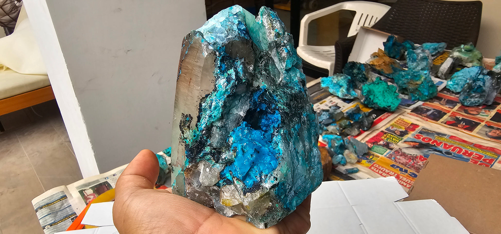 A pair of Quartz crystals are coated by two colorful generations of Chrysocolla on this Tentadora Mine specimen from a small find of 2018. It features richly colored Chrysocolla coating two prismatic and terminated Quartz crystals. The first generation of Chrysocolla is a deep turquoise-blue and looks as though it was airbrushed on the Quartz and it completely covers the crystals. The second generation of Chrysocolla is more complex as it occurs as bubbly growths on the earlier generation and selectively covers only half of the Quartz prisms leaving the terminations mostly uncovered so the points are quite prominent. This later generation is more of a green-blue color and the bubbly surface is a few millimeters thick. This piece has both fantastic textural and color contrast. It is one of a few elegant and high level pieces of a pocket that produced very few great specimens, and we bought all we could all at the time.