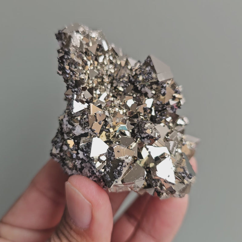 This is beautiful Pyrite Octahedral crystals. It comes from the Huanzala Mine in Peru, The pyrite crystals formed in association with iron.