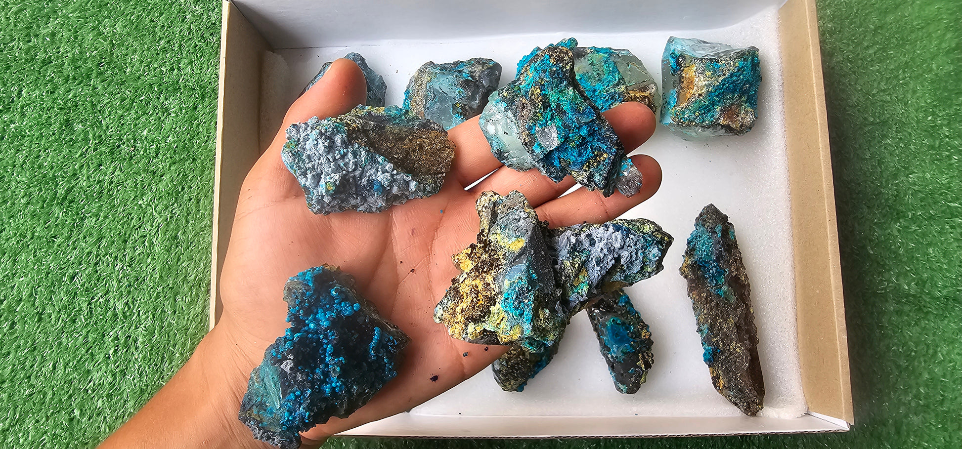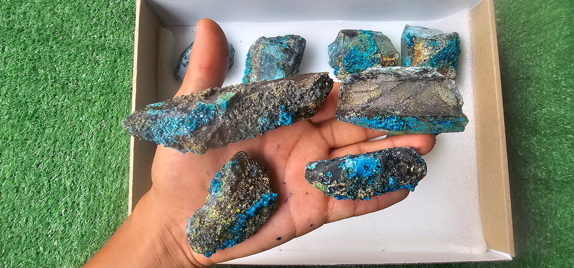 This is a Chrysocolla on Quartz from the Tentadora Mine in Peru. Chrysocolla is a cooper mineral that will frequently grow alongside azurite and malachite. They will sometimes “pseudomorph” each other, meaning one stone will take over or replace the other stone. This mine is particularly well known for it’s distinct and isolated chrysocolla nodules that are hind to find most other places.