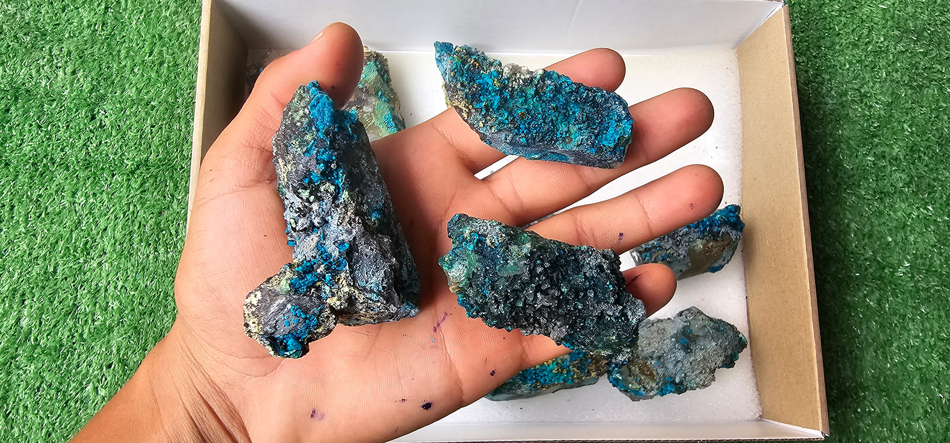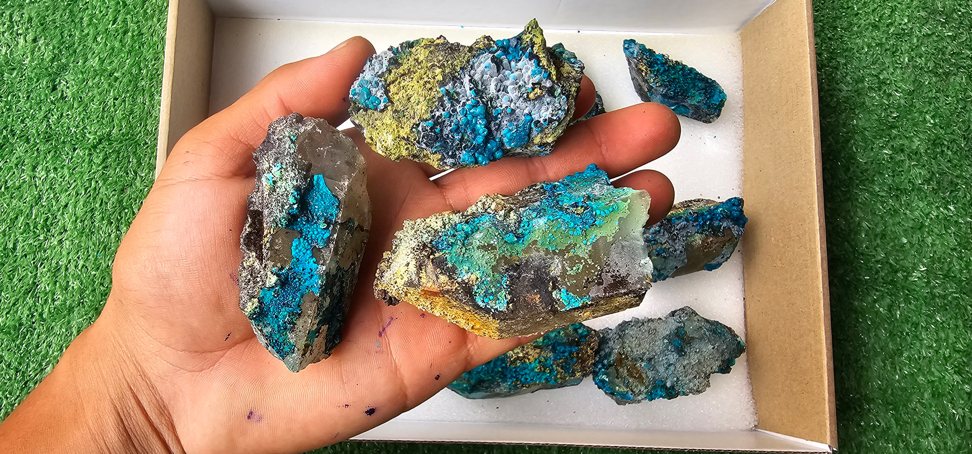 This is a Chrysocolla on Quartz from the Tentadora Mine in Peru. Chrysocolla is a cooper mineral that will frequently grow alongside azurite and malachite. They will sometimes “pseudomorph” each other, meaning one stone will take over or replace the other stone. This mine is particularly well known for it’s distinct and isolated chrysocolla nodules that are hind to find most other places.