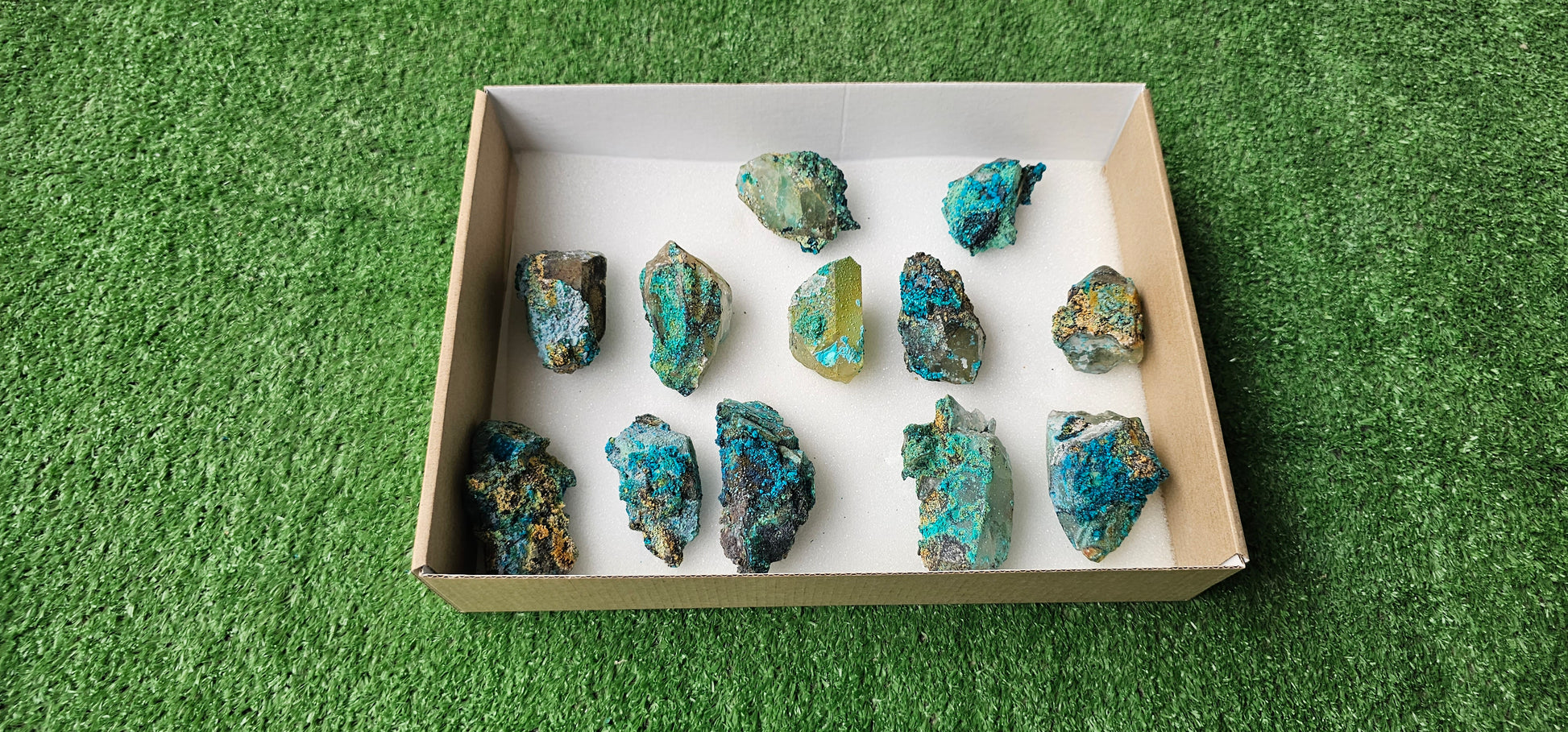 This is a Chrysocolla on Quartz from the Tentadora Mine in Peru. Chrysocolla is a cooper mineral that will frequently grow alongside azurite and malachite. They will sometimes “pseudomorph” each other, meaning one stone will take over or replace the other stone. This mine is particularly well known for it’s distinct and isolated chrysocolla nodules that are hind to find most other places.