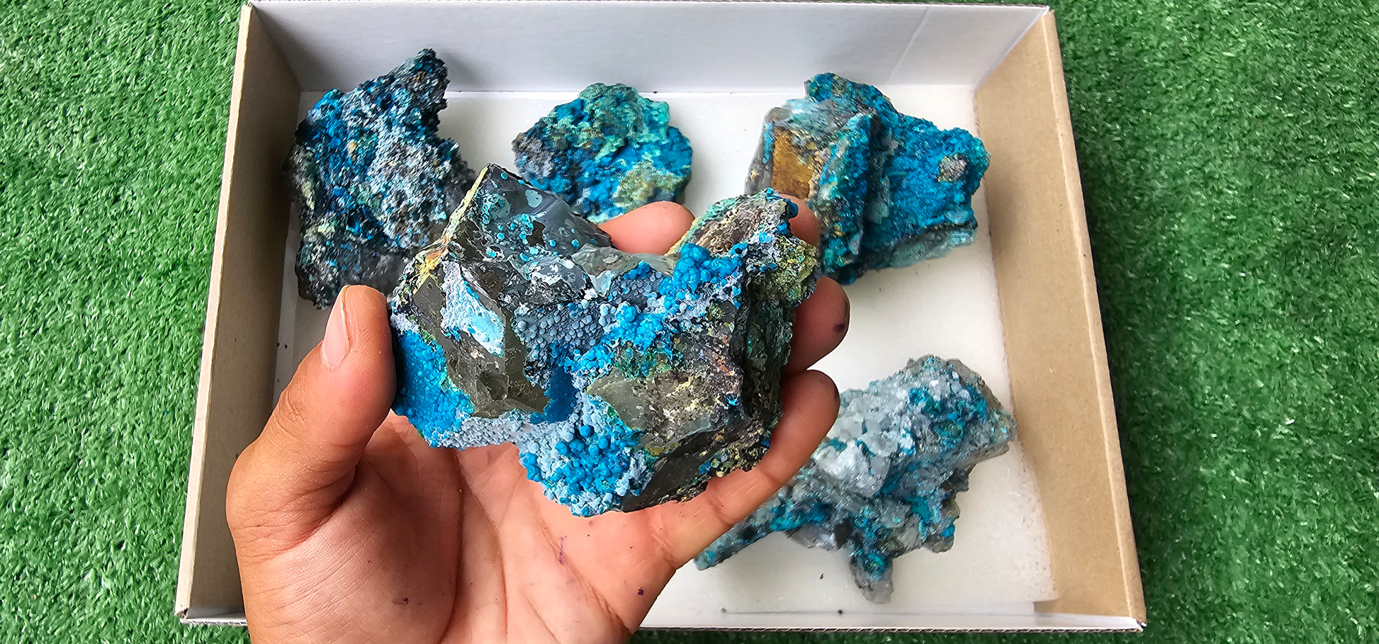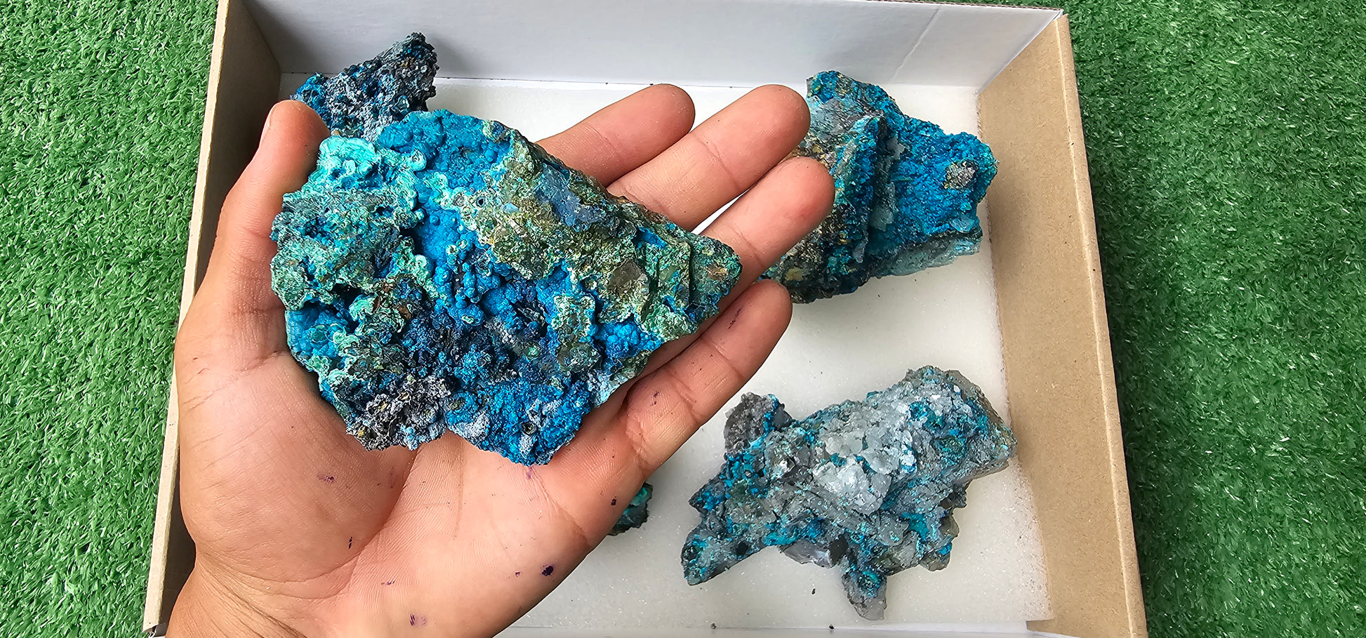This is a Chrysocolla on Quartz from the Tentadora Mine in Peru. Chrysocolla is a cooper mineral that will frequently grow alongside azurite and malachite. They will sometimes “pseudomorph” each other, meaning one stone will take over or replace the other stone. This mine is particularly well known for it’s distinct and isolated chrysocolla nodules that are hind to find most other places.