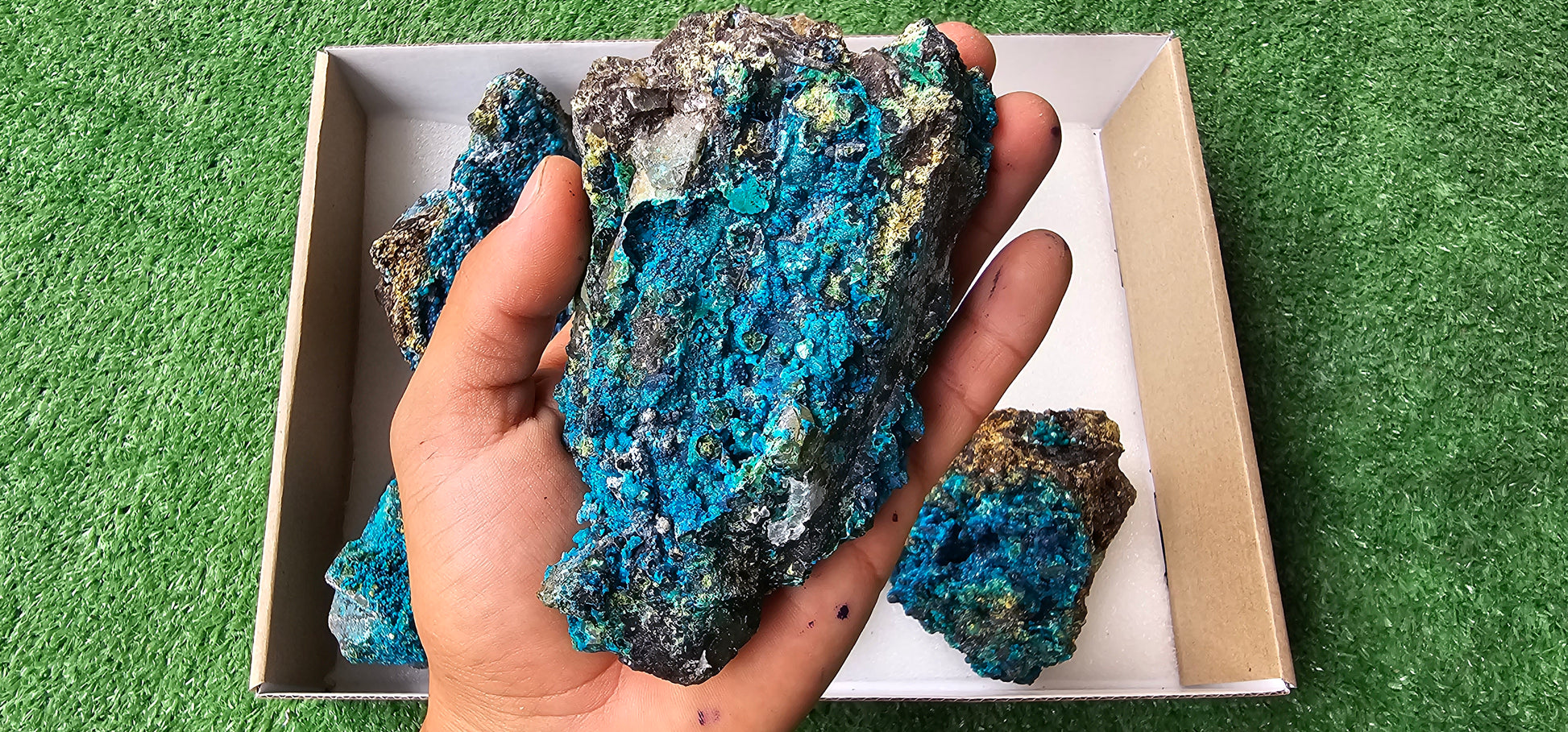 This is a Chrysocolla on Quartz from the Tentadora Mine in Peru. Chrysocolla is a cooper mineral that will frequently grow alongside azurite and malachite. They will sometimes “pseudomorph” each other, meaning one stone will take over or replace the other stone. This mine is particularly well known for it’s distinct and isolated chrysocolla nodules that are hind to find most other places.
