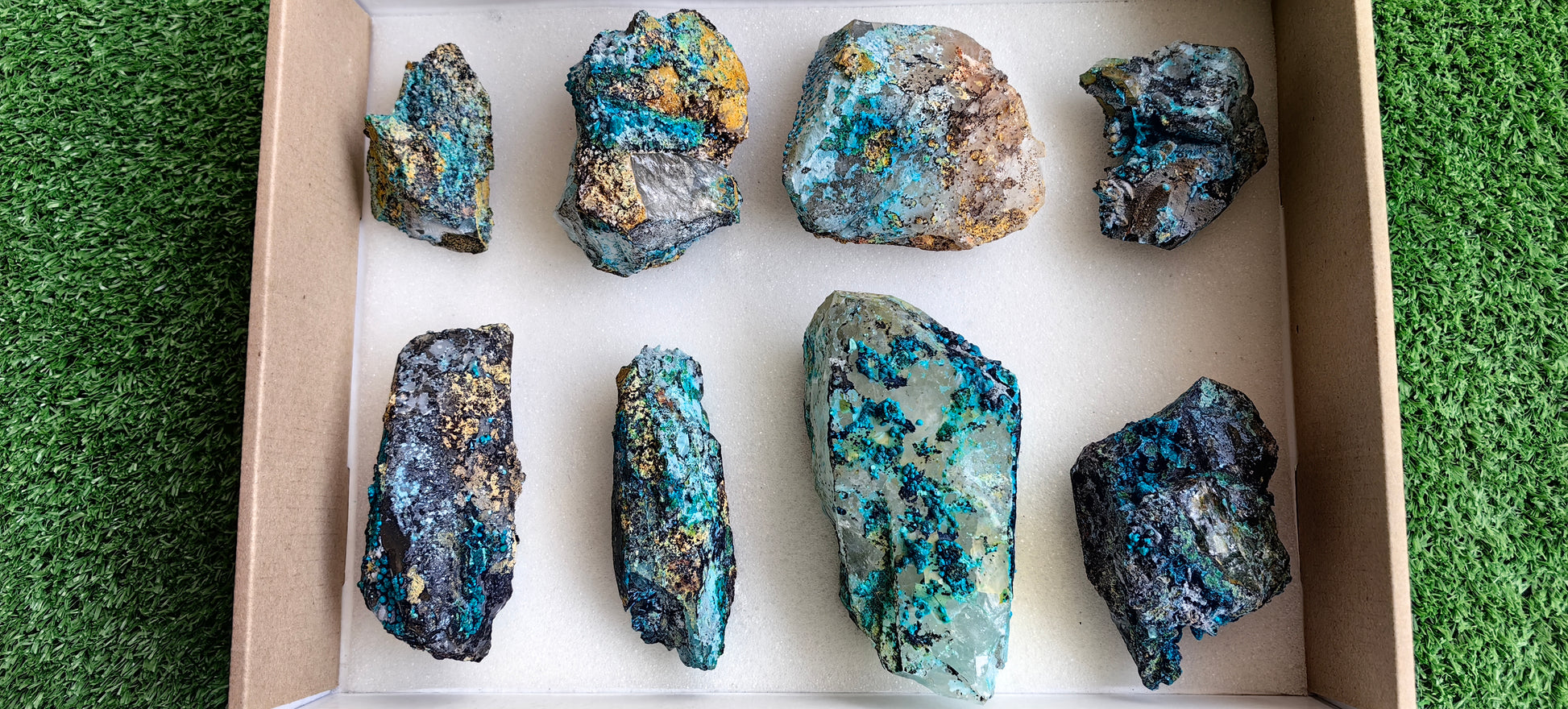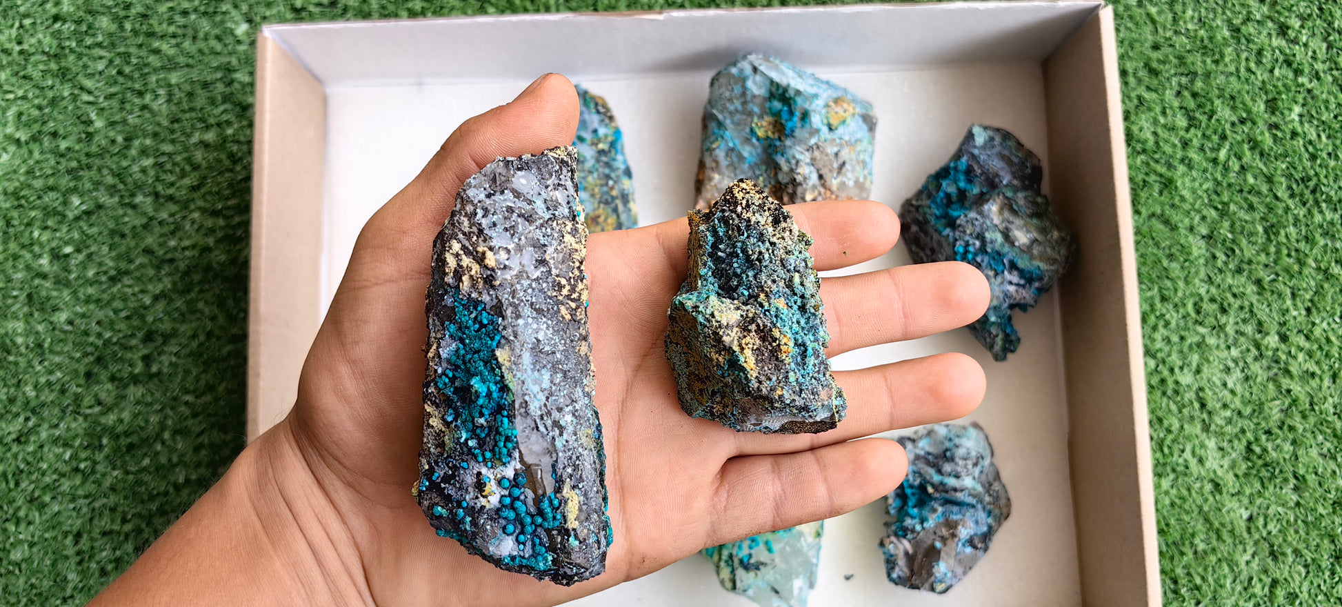 A pair of Quartz crystals are coated by two colorful generations of Chrysocolla on this Tentadora Mine specimen from a small find of 2018. It features richly colored Chrysocolla coating two prismatic and terminated Quartz crystals that are 4.6 and 3.6 cm, respectively. The first generation of Chrysocolla is a deep turquoise-blue and looks as though it was airbrushed on the Quartz and it completely covers the crystals. The second generation of Chrysocolla is more complex as it occurs as bubbly growths on the earlier generation and selectively covers only half of the Quartz prisms leaving the terminations mostly uncovered so the points are quite prominent. This later generation is more of a green-blue color and the bubbly surface is a few millimeters thick. This piece has both fantastic textural and color contrast. It is one of a few elegant and high level pieces of a pocket that produced very few great specimens, and we bought all we could all at the time.