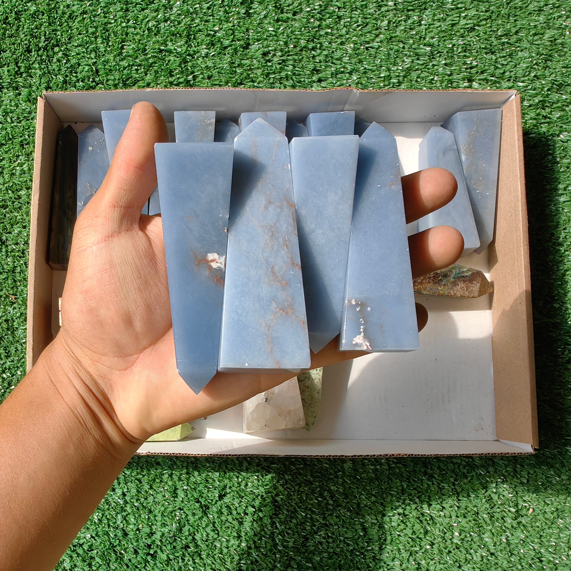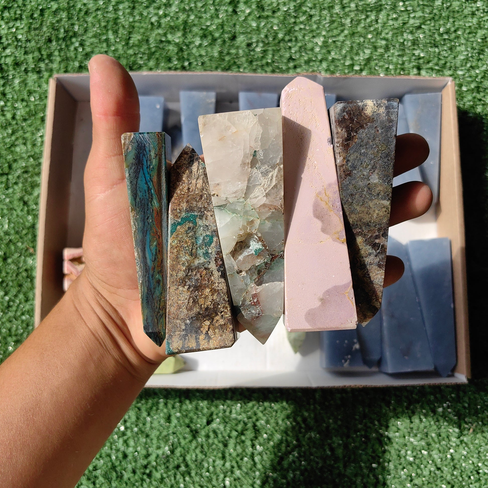 angelite , chrysocolla quartz, rhodocrosite, serpentine